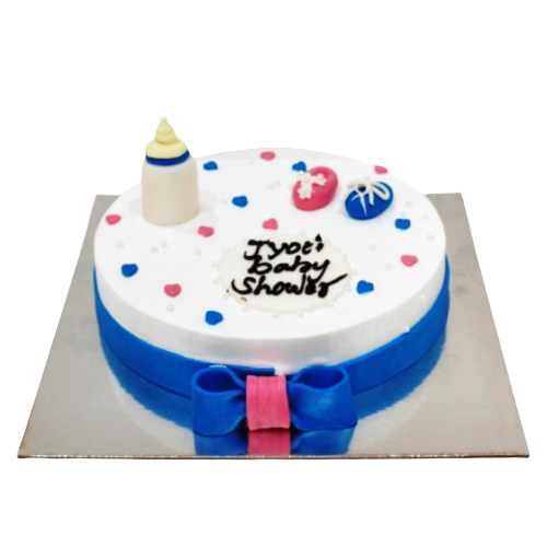 Make your baby shower extra special with this custom Baby Shower Cake featuring baby essentials like a milk bottle, shoes, and heart sprinkles. Designed in soft blue and pink tones, this cake is perfect for celebrating the upcoming arrival of your bundle of joy. Personalized designs available on request.