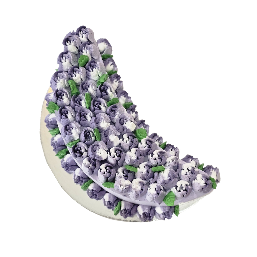 Shaped like a delicate crescent moon, this elegant cake is covered in hand-piped lavender roses with green leaves. A stunning centerpiece for birthdays, bridal showers, or floral-themed events. Beauty and elegance in every bite!