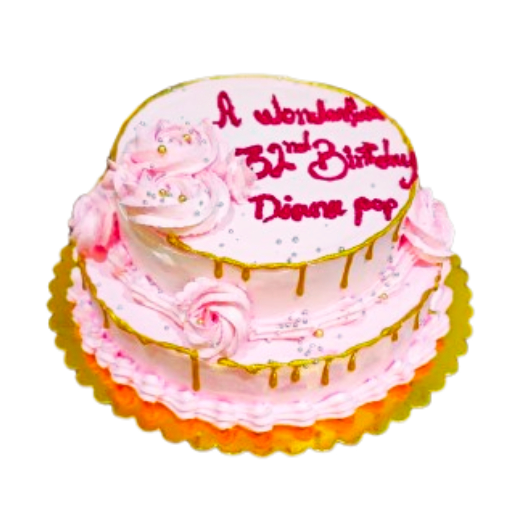 Celebrate in style with our charming 2-tier pink birthday cake, adorned with delicate rosettes, golden drips, and sparkling edible pearls. Perfect for any special birthday celebration, this cake brings elegance and sweetness in every bite.