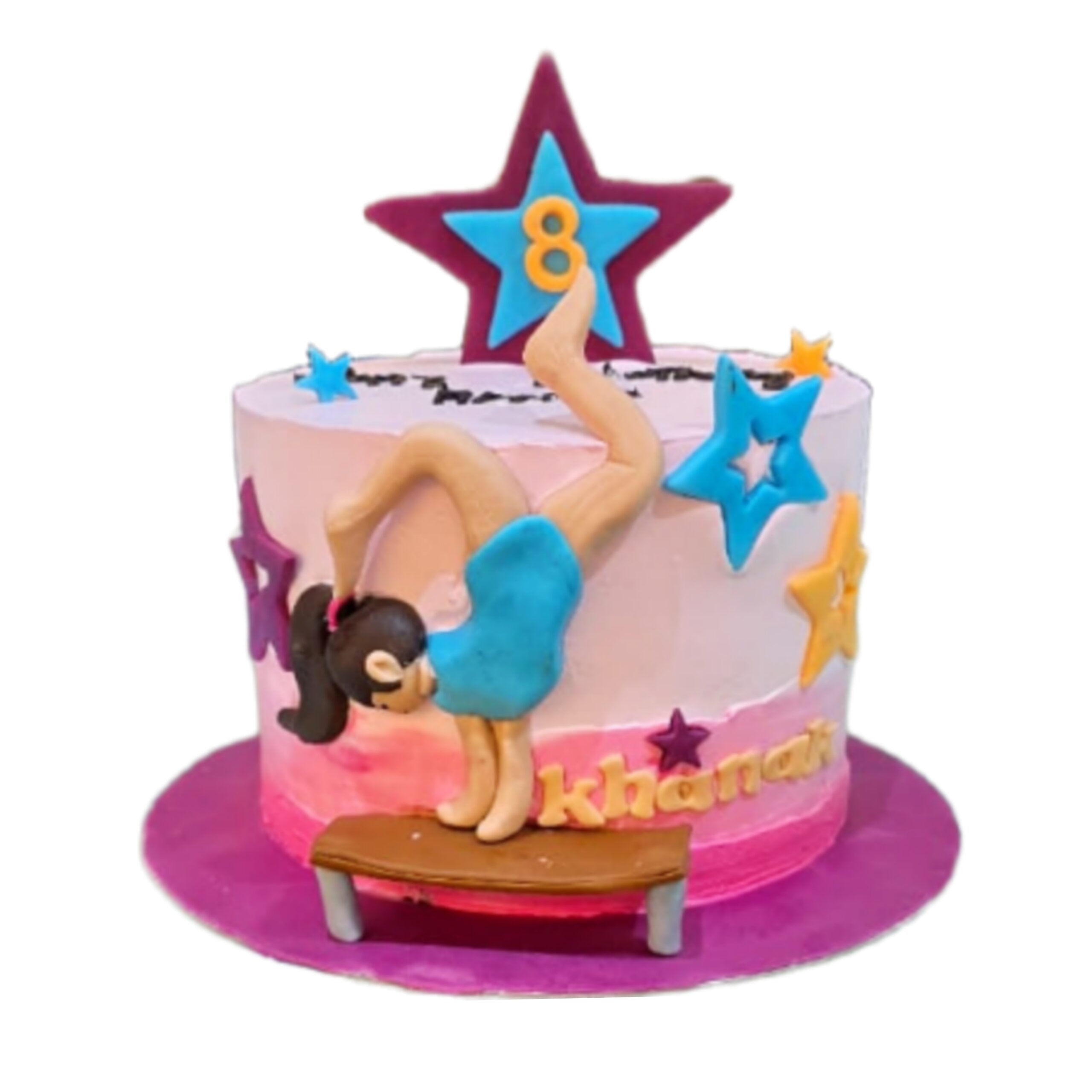 Let your child’s passion shine on her special day with our Gymnastics Themed Birthday Cake. Featuring a hand-crafted fondant gymnast, colorful stars, and a custom name, this cake is perfect for celebrating athletic achievements and birthdays alike. Ideal for little champions turning 8 or any age!
