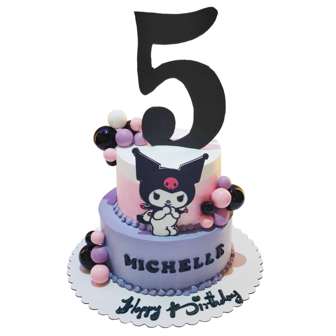 This two-tier creation features pastel pink and purple layers, bubble decorations, and a bold Kuromi character and age topper, making it a whimsical centerpiece for a fabulous birthday.