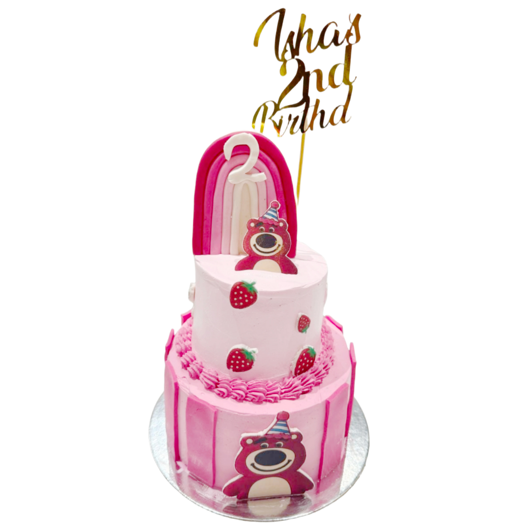 A cute two-tier cake with strawberry accents and a cheerful bear topper – ideal for little ones.