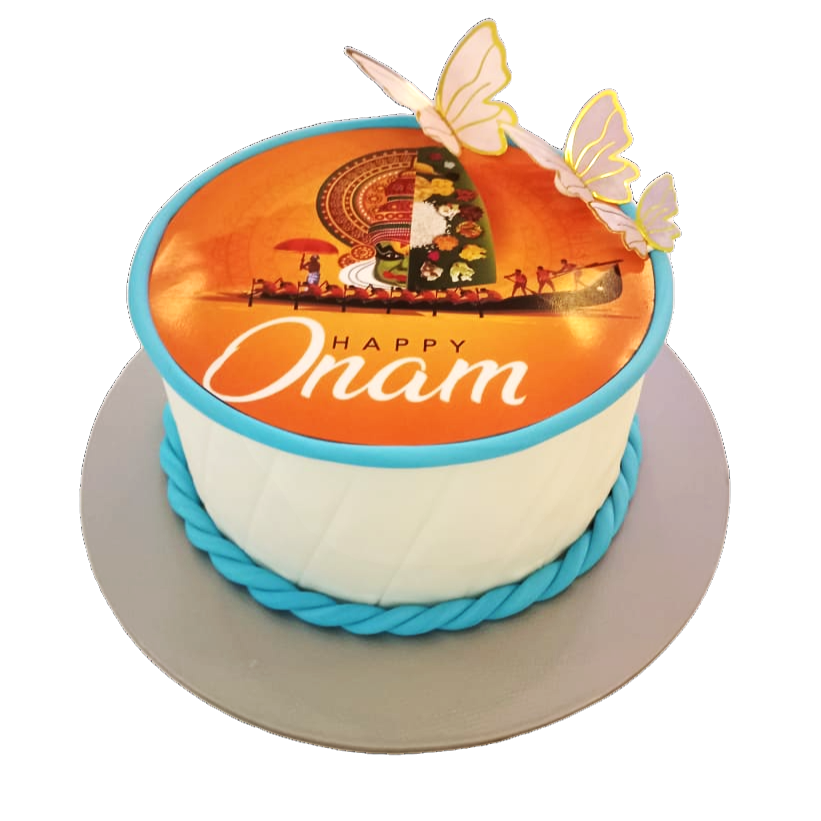 Celebrate the vibrant spirit of Kerala’s biggest festival with our beautifully crafted Onam Celebration Cake. Adorned with Kathakali art, traditional boat race illustration, and edible butterflies, this cake captures the essence of Onam. Perfect for your festive gatherings or gifting, this themed cake brings sweetness and cultural pride together in one bite.