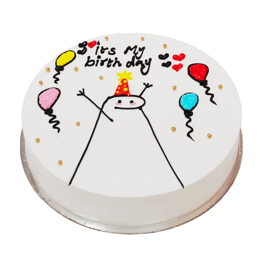 This white cake is decorated with charming hand-drawn balloons, hearts, and a joyful party figure. Perfect for anyone who loves a quirky and fun celebration.