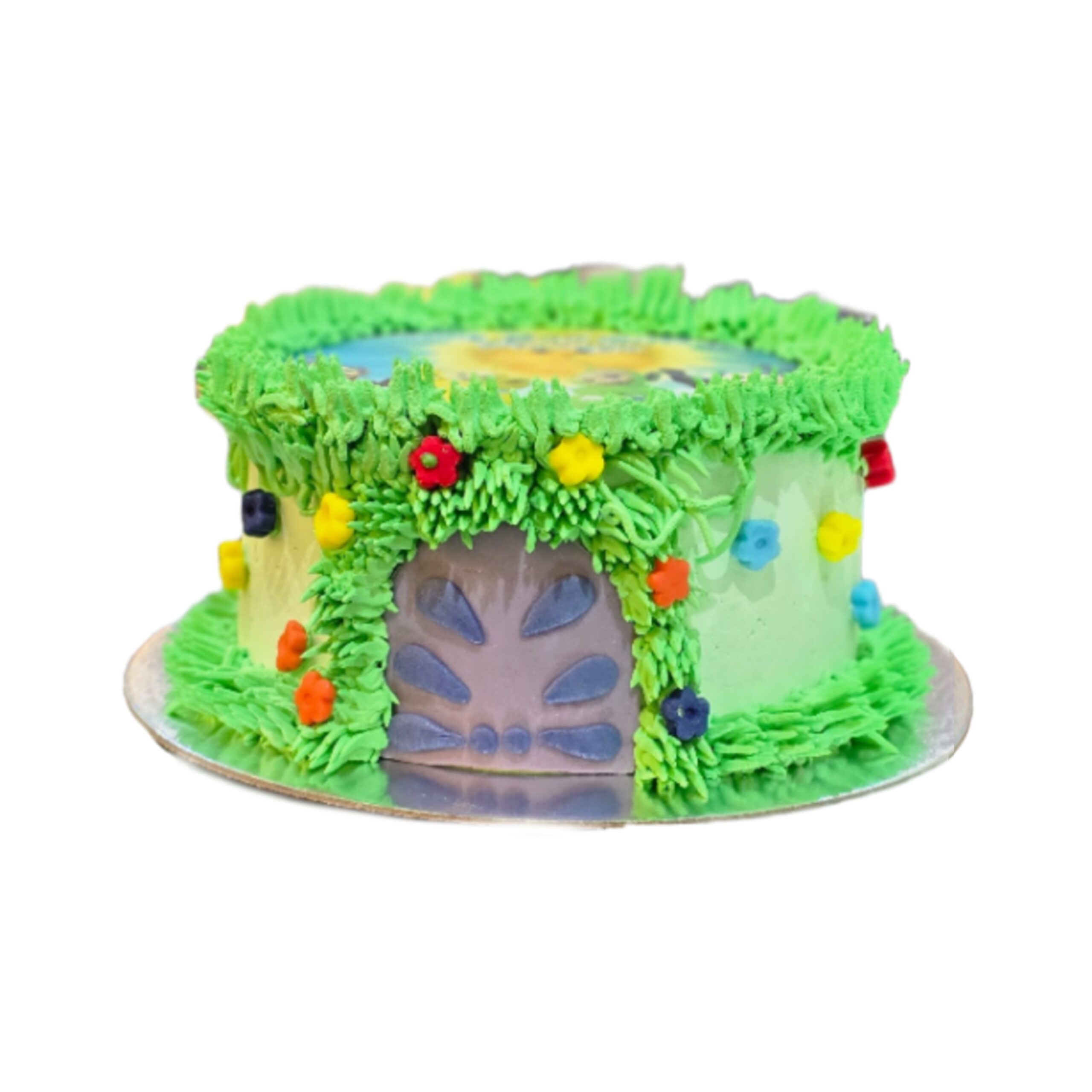 Explore a fantasy-inspired hobbit door garden cake decorated with lush green icing and colorful flowers. A whimsical birthday treat for fairy tale fans.